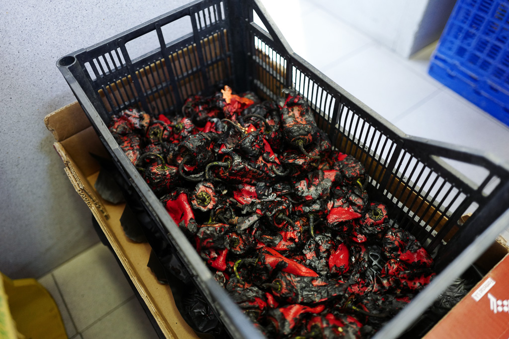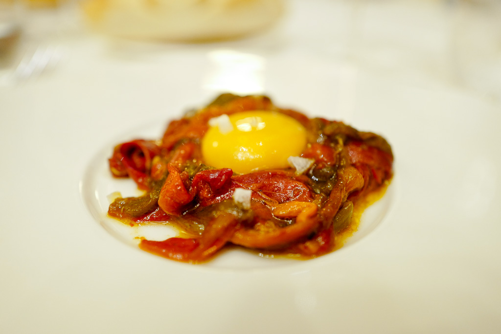 Det er Ninos sønn som nå er kokken på Chef Nino. Det er her vi får pimientos del cristal. Dette er de lange paprikaene, både røde og grønne. De grilles slik at kjøttet blir deilig og mykt og det brente skallet gir en behagelig røyksmak til grønnsakskjøttet. Paprikafiletene skjæres i strimler, blandes med god olivenolje og så drysser man litt flaksalt over. Retten vi fikk servert var rett og slett pimientos del cristal med en rå eggeplomme på. Det var som å spise den deiligste tartar. Vegetarmat kan være veldig godt, altså!