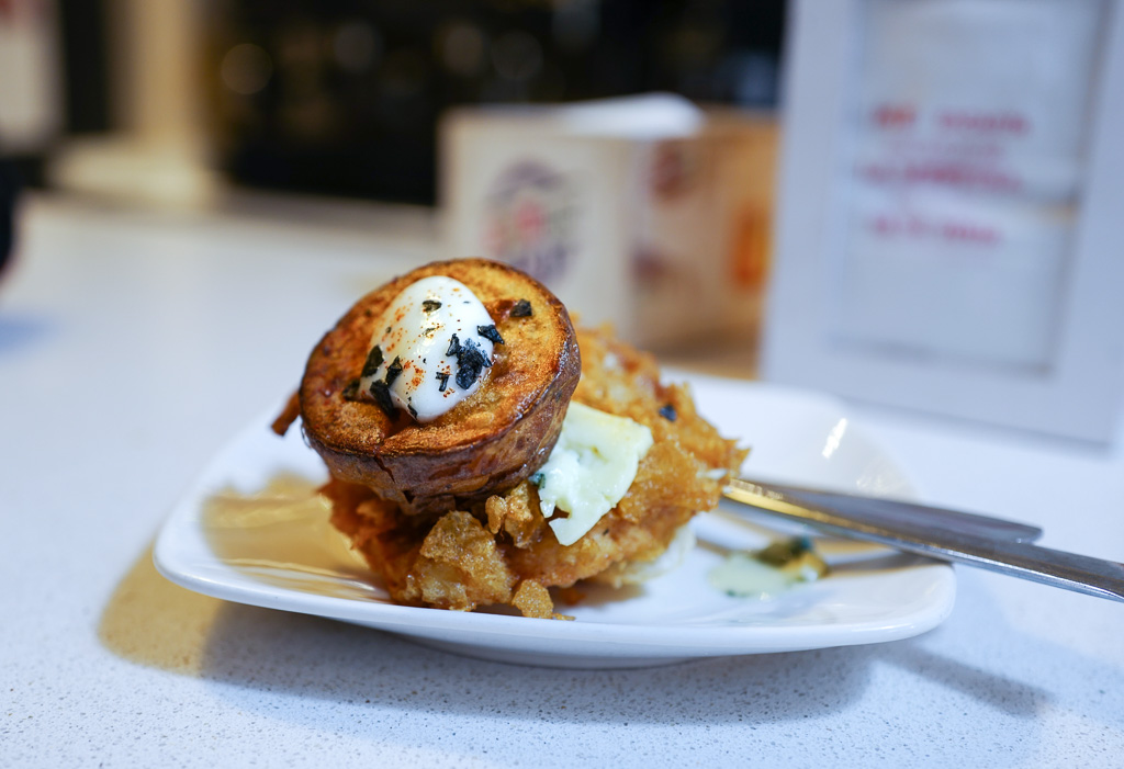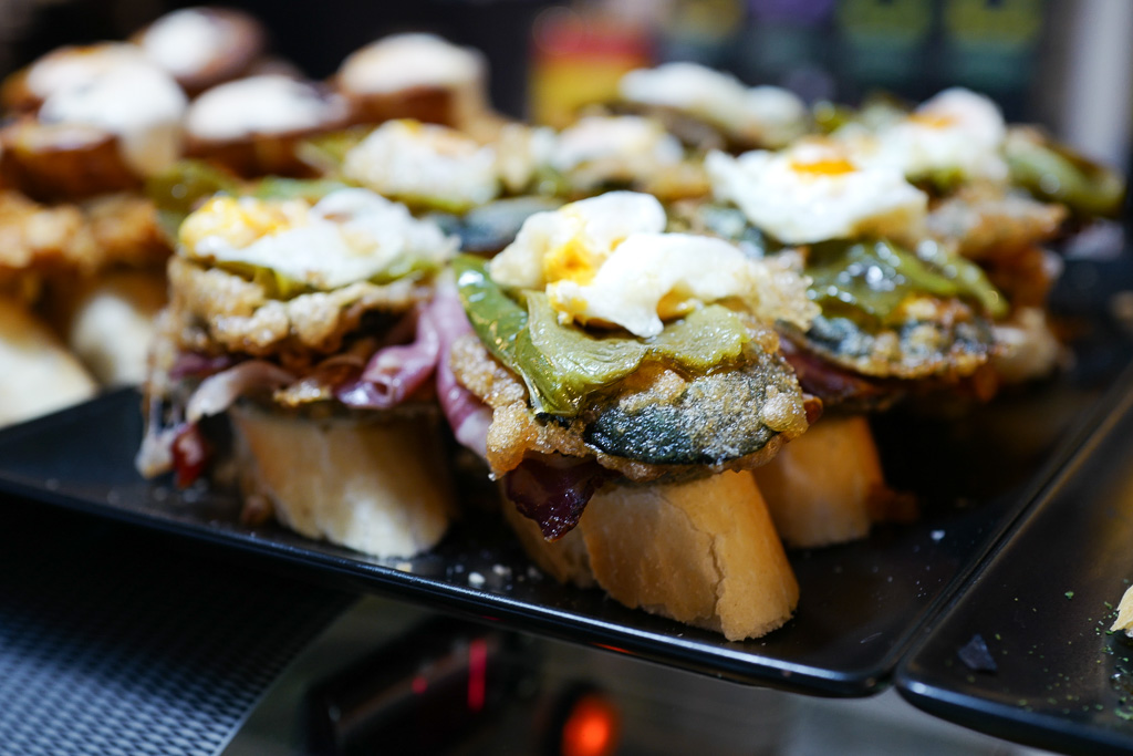 Jeg spiser en aldeles nydelig pinchos med tempurastekt squash, grillet paprika, spekeskinke og stekt vaktelegg på toppen.