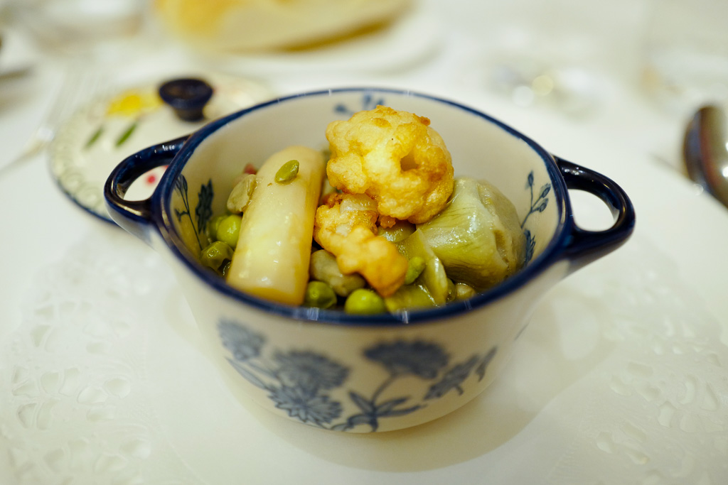 Så kommer en liten gryte med blomkål, hestebønner, løk og en deilig kraft laget på skinke.