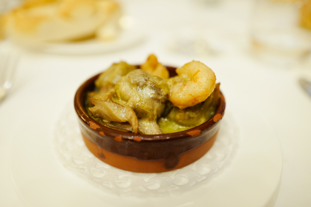 Artisjokk, østershattsopp (klassisk La Rioja), reker, hvitløk og fløte.