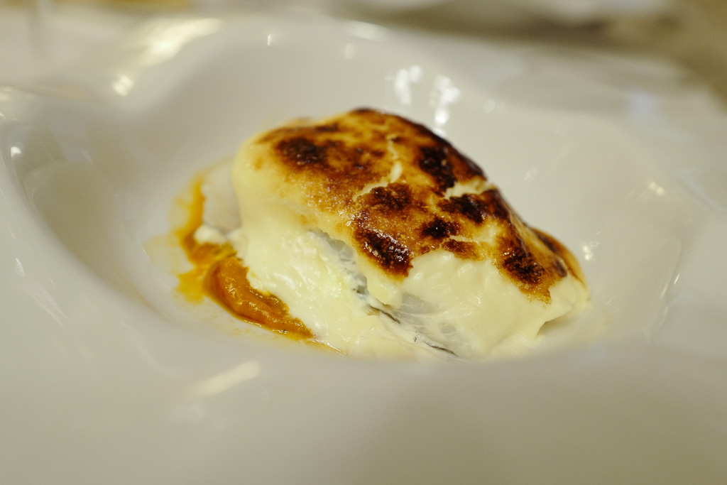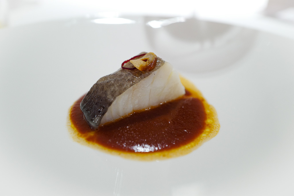 Vi får en nydelig klippfiskrett med gratinert aioli, saus laget på pimientos del cristal og tomat.