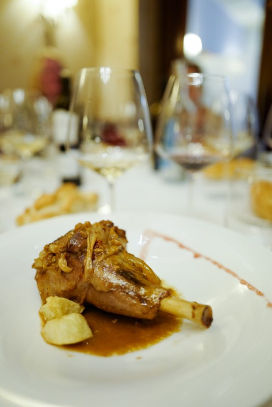 Det er mye mat og det skal du være oppmerksom på når du reiser rundt på landsbygda. Du får store retter – og mange retter. Det er derfor på sin plass å servere en hel lammeskank per person sånn til slutt. Oppskriften er over 100 år gammel og skanken serveres med en soppsaus og vindruegelé til.