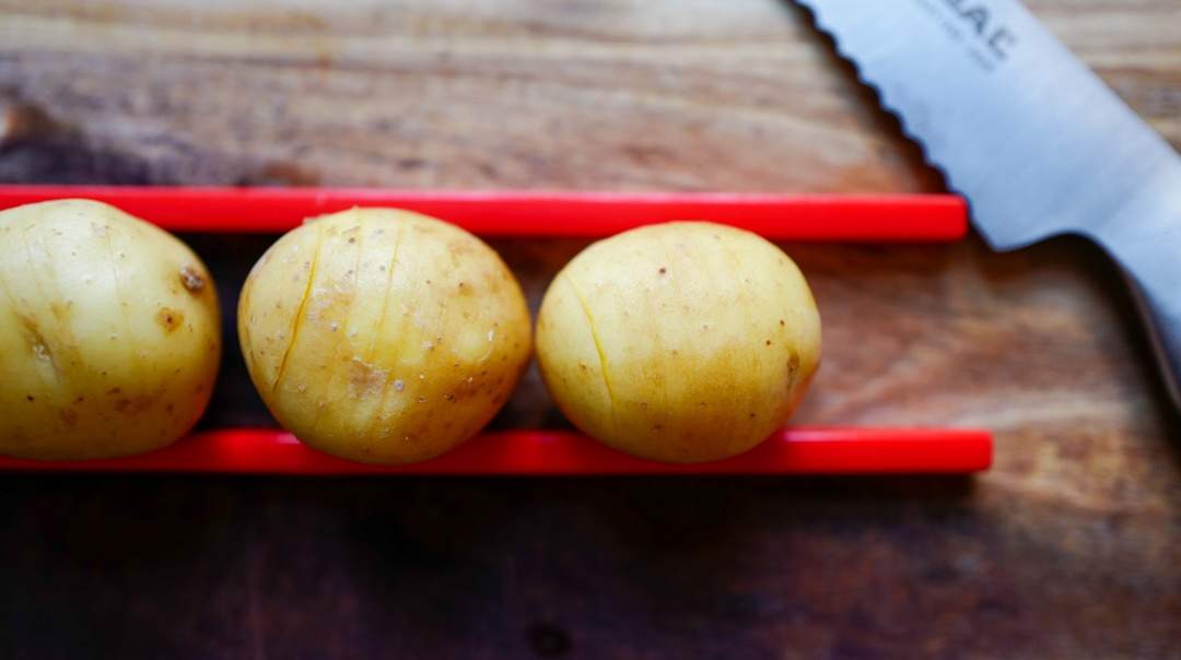 Potetene jeg bruker er Morenepoteter fra Bjertnæs & Hoel. Trikset for å få perfekte striper i potetene er å bruke to spisepinner som du legger på hver side av poteten. Når du skjærer skiver av poteten vil kniven stoppe ved spisepinnene slik at du unngår å skjære helt igjennom poteten. Dermed beholder du poteten hel.