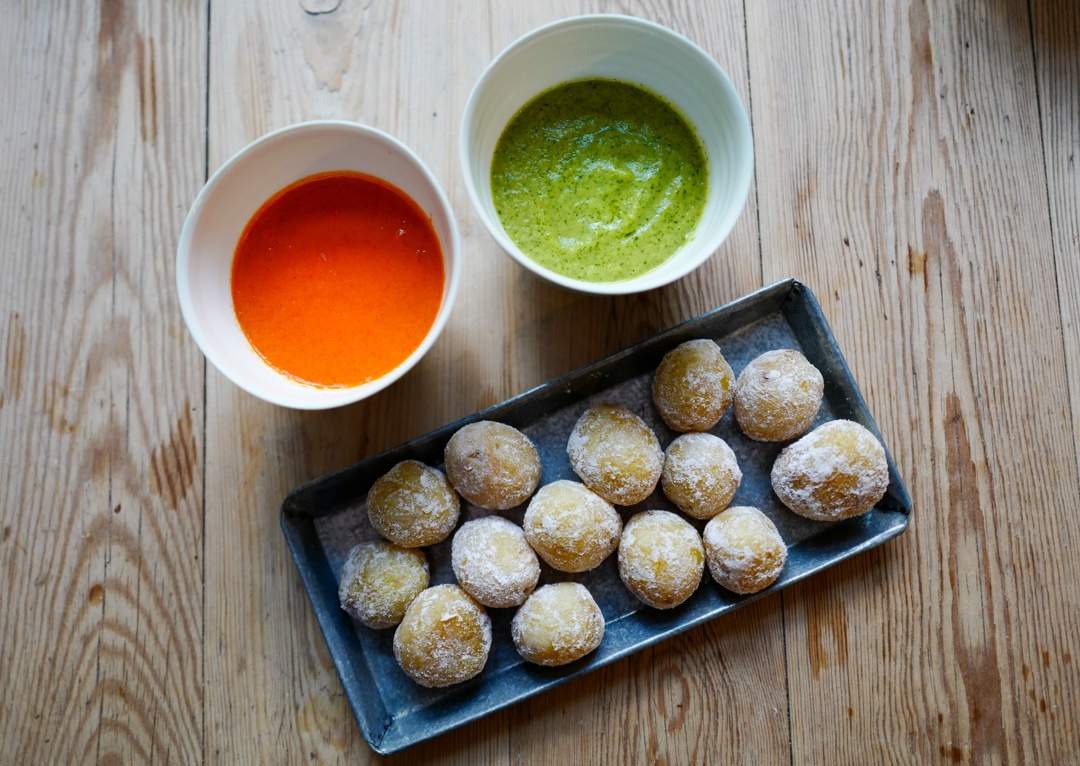 Kveldens første potetrett er saltkokte poteter servert med rød og grønn mojo. En klassiker fra Kanariøyene som er lett å lage hjemme. Jeg bruker Morenepoteter og havsalt.