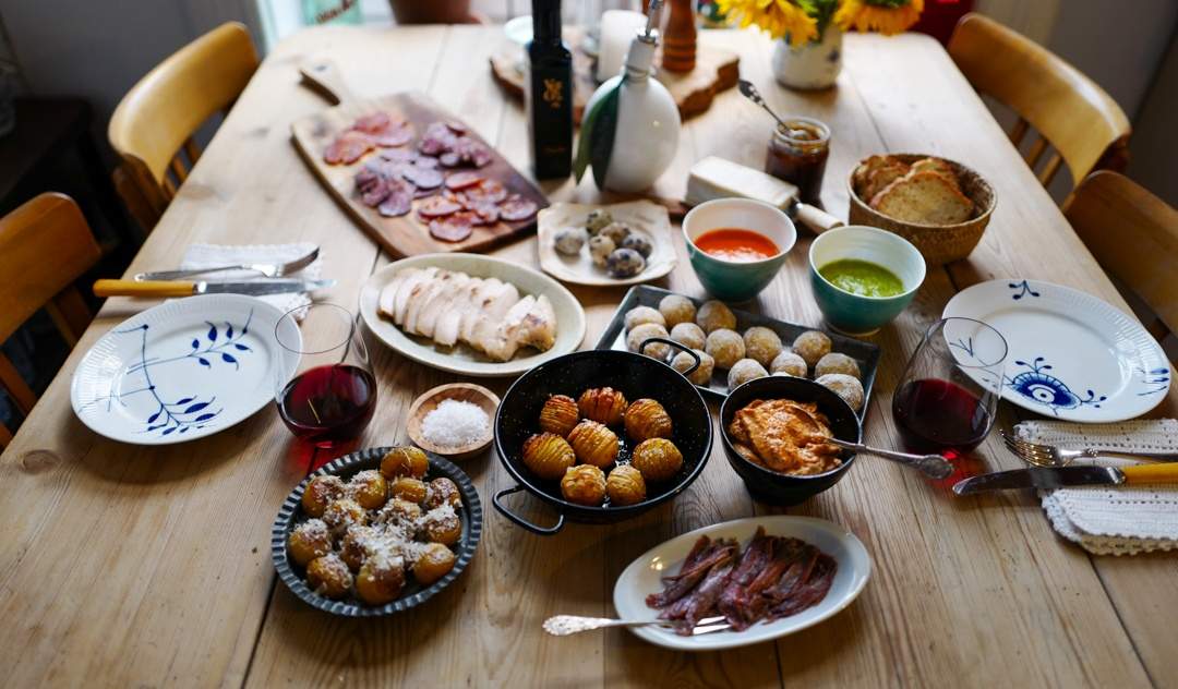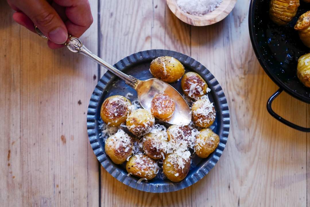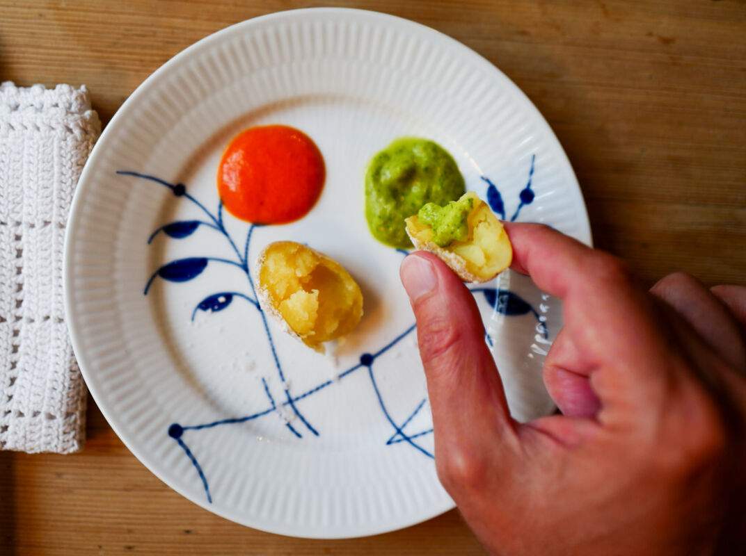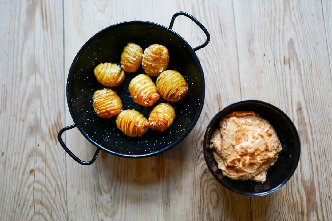 Potetene egner seg som tilbehør, men også som egne retter slik jeg presenterer dem her. Jeg har laget tre retter som for eksempel kan egne seg på tapasbordet sammen med gode ingredienser fra inn- og utland. Server dem til spekemat eller ansjosfileter, vaktelegg eller til godt brød og ost. Ja, alt det du best liker å sette på smårettbordet.