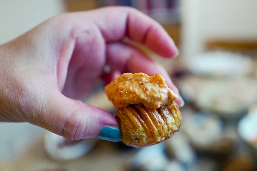 Ha fett og kjøtt i en beholder og tilsett 1/2 ts røkt paprikapulver (hvis du har. Hvis ikke, bør du kjøpe en boks. Det er et perfekt krydder å ha i hylla). Tilsett 2-3 ss kvalitetsrømme og kjør til en krem med stavmikser. Fiks ferdig krem som du har lyst å bruk på alt! Legg store klatter på hasselback-potetene og nyt!