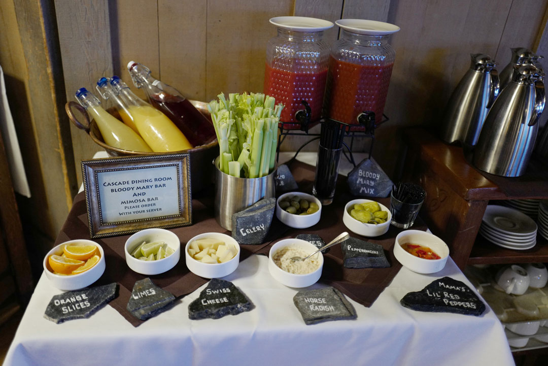 Hotellet har flere serveringsteder og et stort utvalg av viner fra Oregon. Du kan nyte en bedre middag ved det faste bordet (nummer 12) til den tidligere amerikanske presidenten Theodore Roosevelt i Cascade Dining Room der Jason Smith er kjøkkensjef, eller spise en enkel middag i baren foran peisen i det store, lune oppholdsrommet. Timberline Lodge har også en legendarisk kakao med kanelstang som er deilig å nyte foran peisen etter en lang dag i frisk fjelluft.