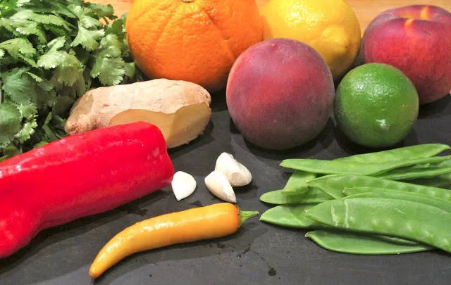 | Du trenger koriander, paprika, chili, ingefær, nektarin, sukkererter, hvitløk, lime og appelsin. Sitronen ville bli med på bildet, og da fikk den lov til det. Men den skal ikke med i retten. |