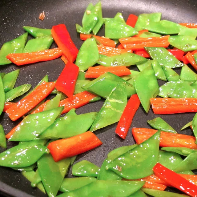 | Sukkererter og paprika wokes lett i en panne med litt olje og et saltdryss. Konsistensen skal være sprø. |