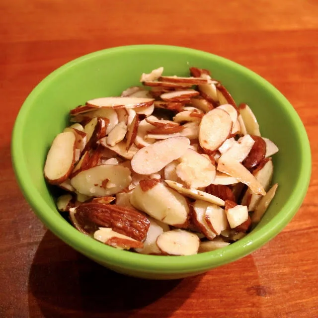 | Mandelflak ristes lett i en panne med 1 ts olje. Et lite satdryss på toppen. |