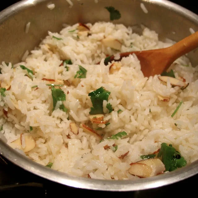 | Bland mandler og friske korianderblader i risen. Server sammen fisken, nektariener skåret i skiver, grønsaker og sitrussaus. |