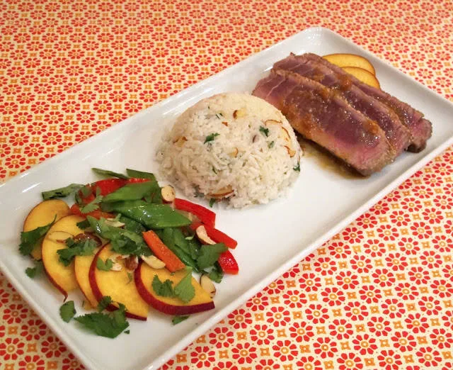 Retten jeg lagde var: Lettstekt tunfisk med sitrussaus, ris med mandler og koriander, lettstekte grønnsaker og nektarin.