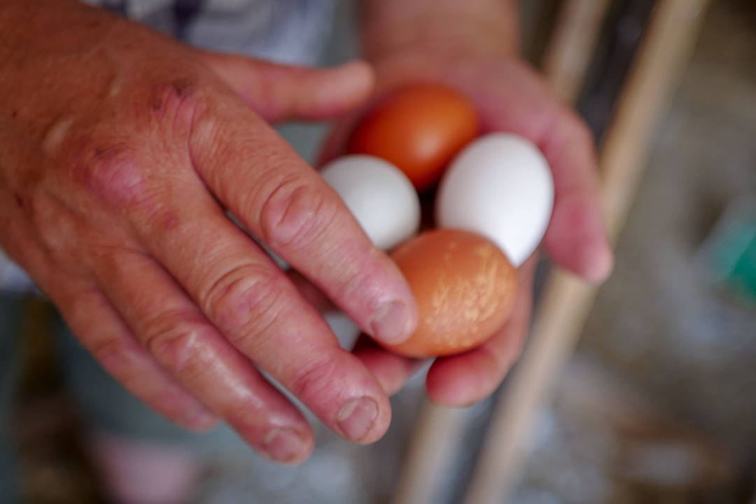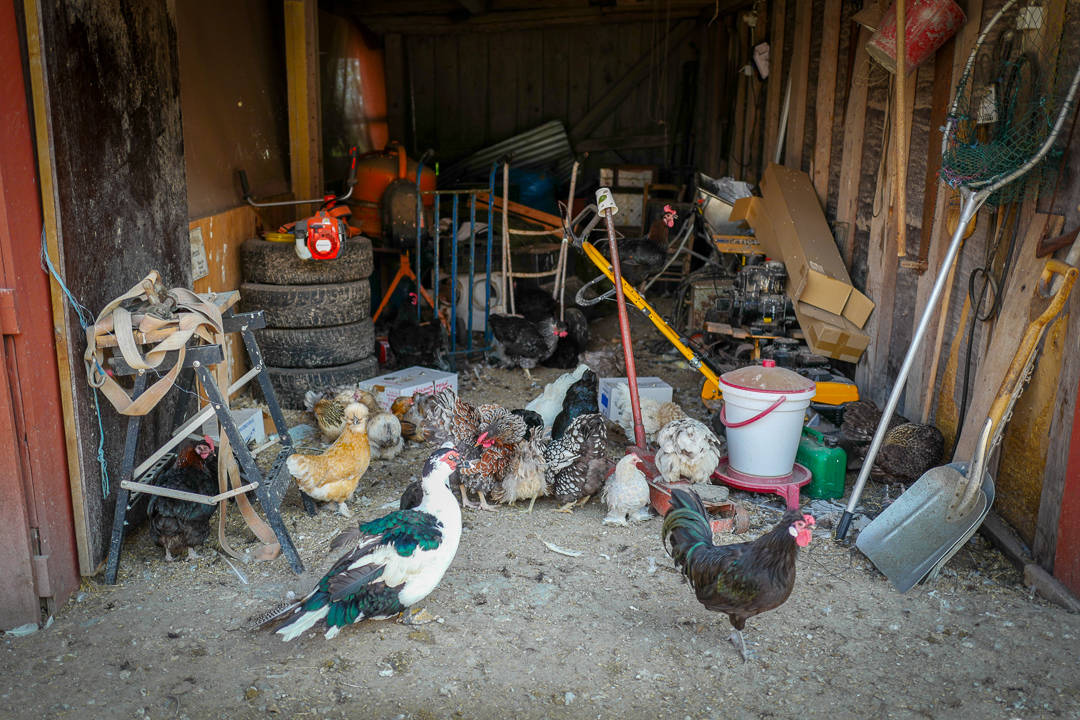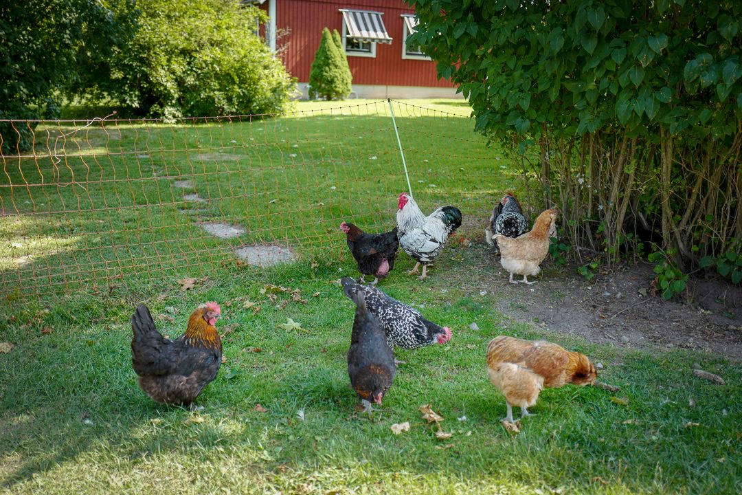 Karin og Håkan driver Gårdsmejeri Ostbiten/ Ateljé Norrgården. Økogården har lam og kuer. Men også en skokk med forskjellige fugler. Det er høner. Det er ender og det er en svær påfugl. De ser ut til å trives i hverandres selskap og vagger rundt på gårdstunet. Noen høner verper egg, og Håkan går inn og «stjeler» et par nylagte egg. Hønene blir rasende og det er litt av et lurveleven inne i hønsehuset.