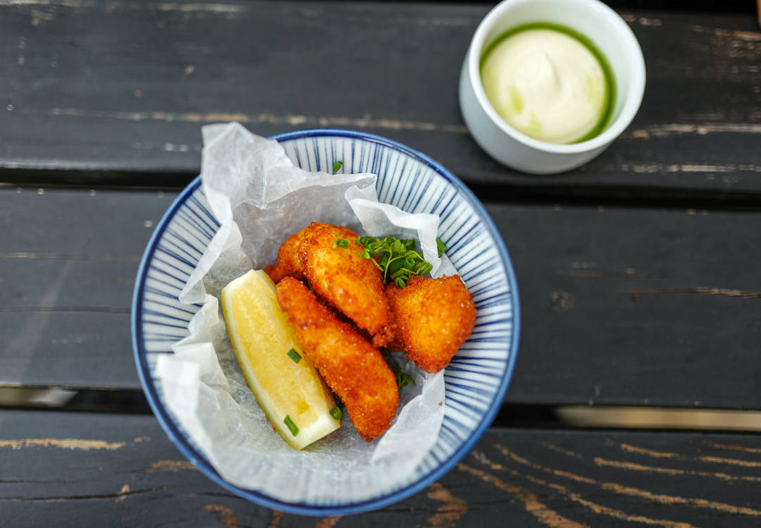 Maten kommer på bordet. Først får vi nyfritert havabbor med sitronaioli. Små fiskenuggets med den deiligste majones. Nam!
