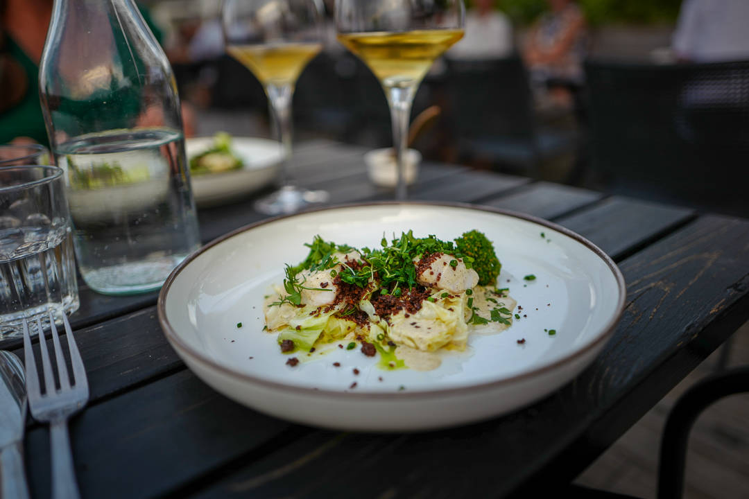Den lokale fisken, Hjälmargös blir servert med deilig sommerkål, brokkoli, brødsmuler og brunt smør. Nok en perfekt rett fra Sjökrogen. Katalansk naturvin (Xarel·lo-druen) til skader heller ikke.