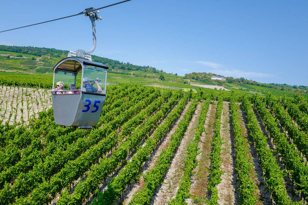 Jeg sitter i en liten metalkurv og suser (suser er kanskje ikke ordet. Det går jo i sneglefart) over vinmarkene og utsikten utover landsbyen og elven er helt magisk! Dette må du gjøre hvis du er i traktene.