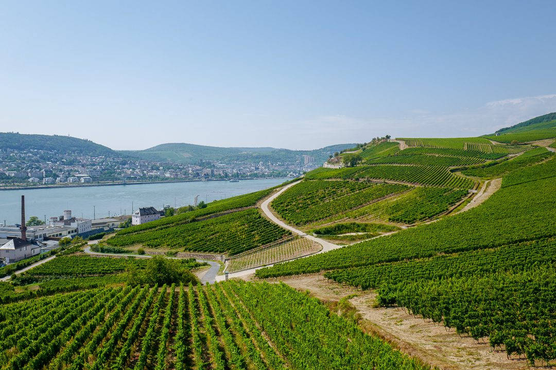 Jeg kommer på riktig tog og vi kjører langs vinmarker og elven Rhinen. Det er vakkert og utrolig overraskende at dette landskapet ligger så nære storbyen Wiesbaden.