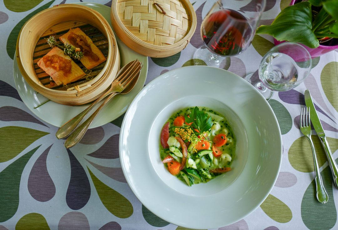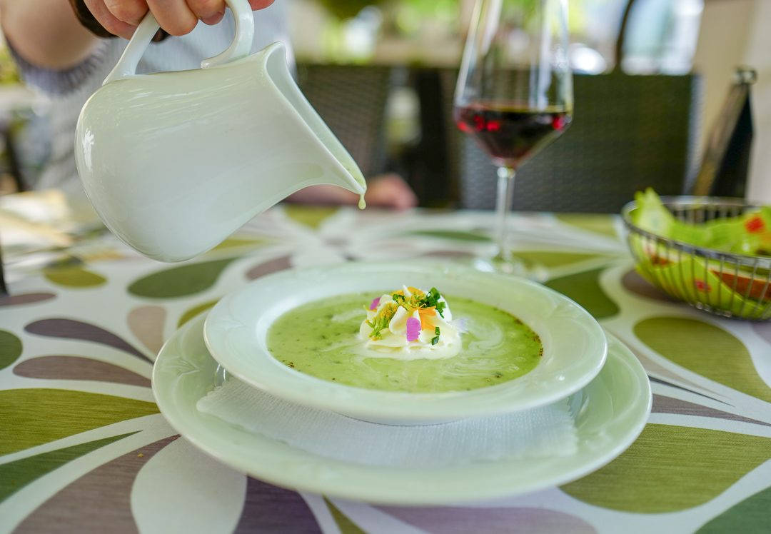 Neste rett er en grønnsakssuppe kokt med hvitvin, deilige urter og krydder servert med krem og krutong. Også denne retten er nydelig pyntet med spiselige blomster.