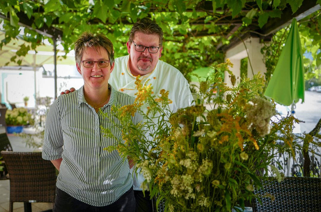 Jeg går til Hotel Zwei Mohren der jeg har en lunsjdate med Sandra Schambach-Unger og Torsten Schambach, begge er kokker. De gjør noe helt spesielt, nemlig å lage mat med ville urter og blomster som de finner i vinmarkene i området.