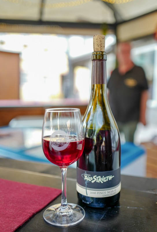Jeg prøver et par viner fra to forskjellige produsenter og faller pladask for en ufiltrert Pinot Noir fra produsent Thilo Strieth. Hallo! Kan noen ta inn denne vinen?