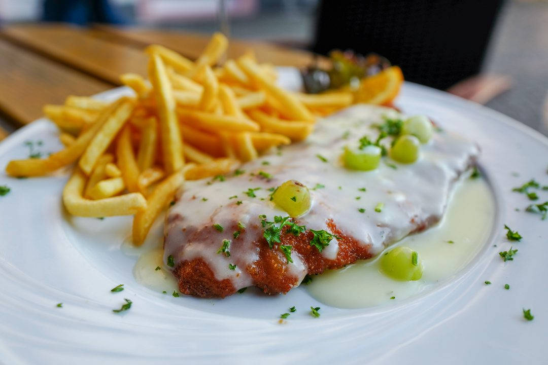 Tynne skiver av perfekt rosa kalvekjøtt servers med den klassiske grønne sausen, Grüne Soße som dressing. Navnet Vitello Goethe er veldig smart med tanke på at det var Goethes mor som fant opp oppskriften på den kjente grønne sausen som serveres i denne delen av Tyskland. Men dette er ikke alt. Retten som Torsten Schambach har laget serveres med de flotteste blomster, urter og selvsagt kapers. Det er rett og slett en fryd for øyne og gane. En mesterlig rett på alle måter. Jeg nyter et glass lokal Pinot Noir til og storkoser meg.