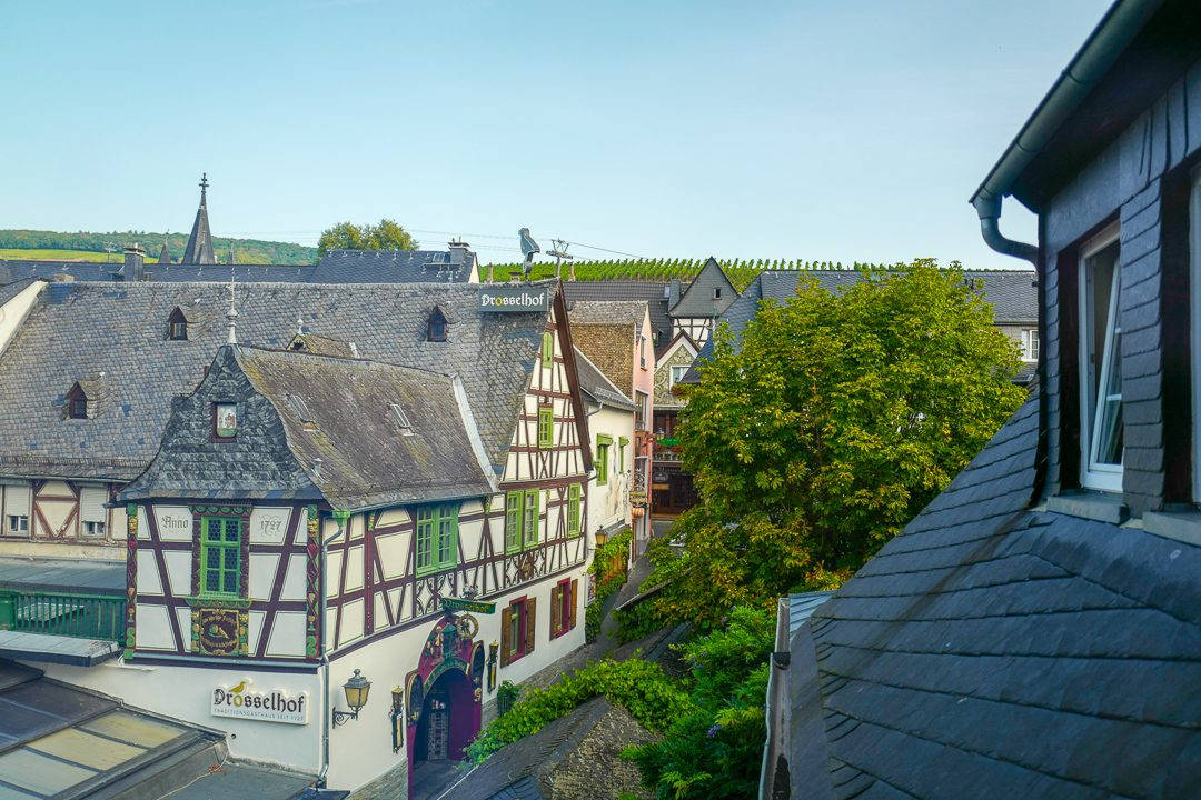 Rommet mitt er enkelt, men jeg har utsikt til vinmarkene som ligger over hustakene. Ja. De gjør faktisk det, for landsbyen ligger i nedoverbakke ned mot elven Rhinen og vinmarkene ligger høyt oppe i landskapet. Det ser sjukt rart ut, da.