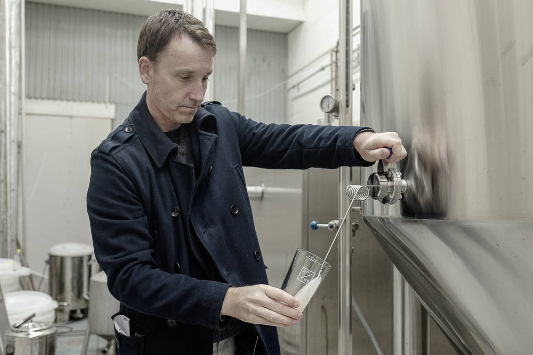 I år skal de produsere 35 000 flasker. – Vi har kapasitet til å produsere 40 000 flasker, sier Kenneth. – Det er viktig å være her i Slakthusområdet. Her skjer det mye. Vårt lokale var tidligere svinehus og slakteri. Nå serverer vi spekemat og vin, sier Kenneth.