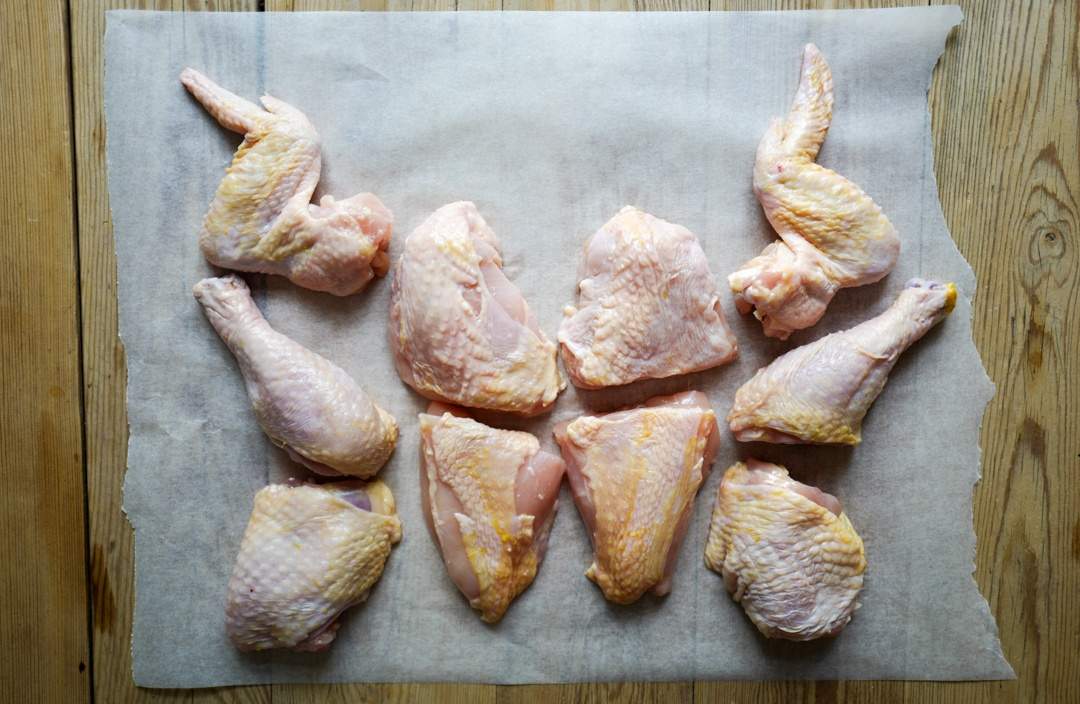 Å dele en kylling kan være litt utfordrende hvis du aldri har gjort det tidligere. Se på bildet av delene jeg har lagt utover bakepapiret, så får du en tegning over hvordan det gjøres. Du har vingene (som har masse godt kjøtt på seg), lårene er store og hvert av dem får du to lubne fine stykker. Brystene er også veldig store og de passer godt å dele i to deler. Når du er ferdig med å dele kyllingen sitter du altså igjen med 10 deler pluss skroget. Skroget kan du koke kraft på, så prøv deg på det.