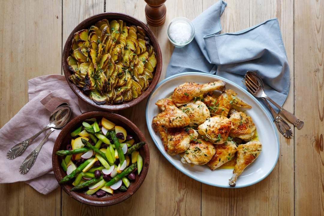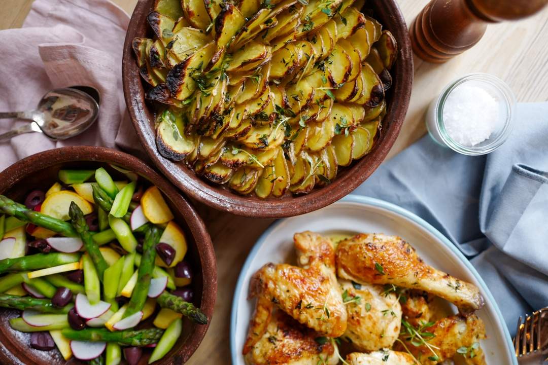 - Server kylling med poteter og aspargessalat.
