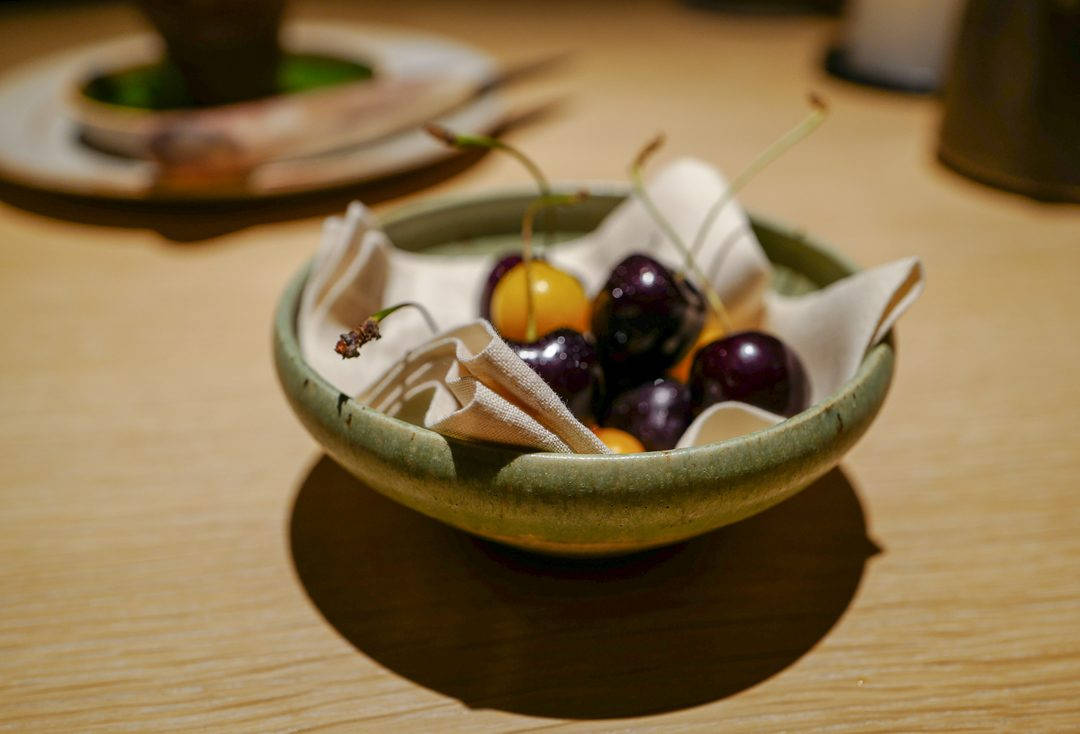 Lokalet på Noma har skiftet ham. Da sjømatsesongen pågikk var det tørket tang og tørkede sjødyr på veggene. Nå er det blomster og høy. Dørene ut til området rundt er åpnet opp, og vi sitter praktisk talt ute i naturen og ser himmelen forandre seg i takt med klokka. Vi har aftenbord og dermed får vi se hvordan naturen og lokalet skifter belysning etterhvert som kvelden siger på.