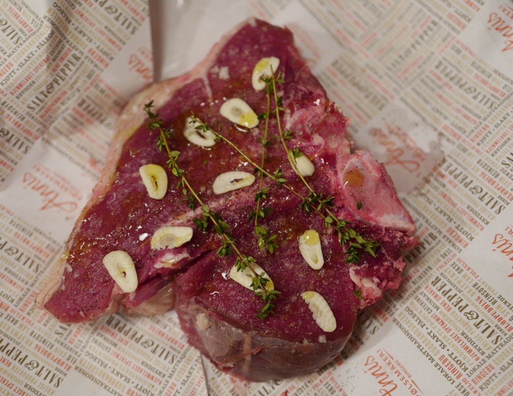Det gjorde jeg. Jeg hadde på forhånd snakket med Daniel Byskov hos Annis som hadde plukket ut en perfekt T-bone Steak til meg. Et par margbein ville jeg også ha. Et til å grille for å smøre på flatbrød med salt og pepper (akkurat slik jeg likte det aller best da jeg var liten) og et til å bruke i potetmosen. For en intens og herlig smak det gir!