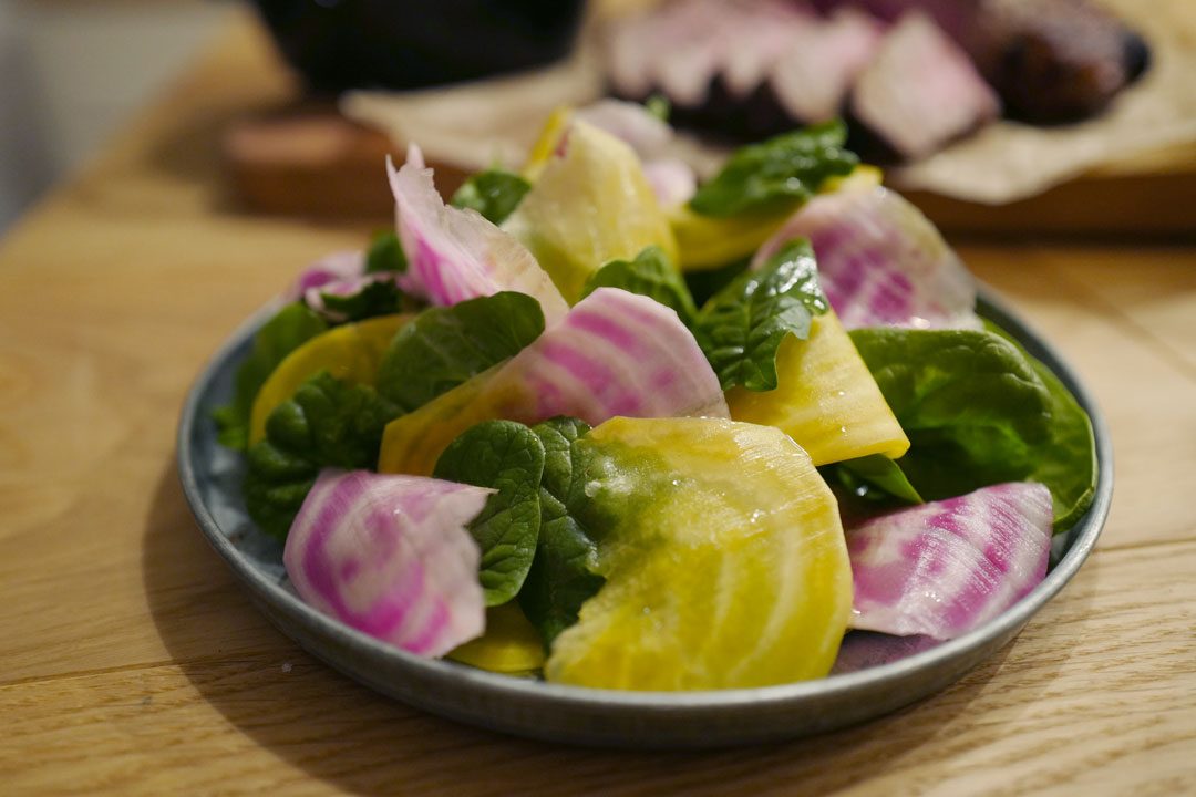 Dander spinatblader og beteskiver på et fat og ha litt god olivenolje og et dryss flaksalt.