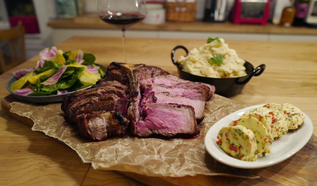 Grillet T-Bone Steak med urtesmør, potetmos med margbein og frisk salat