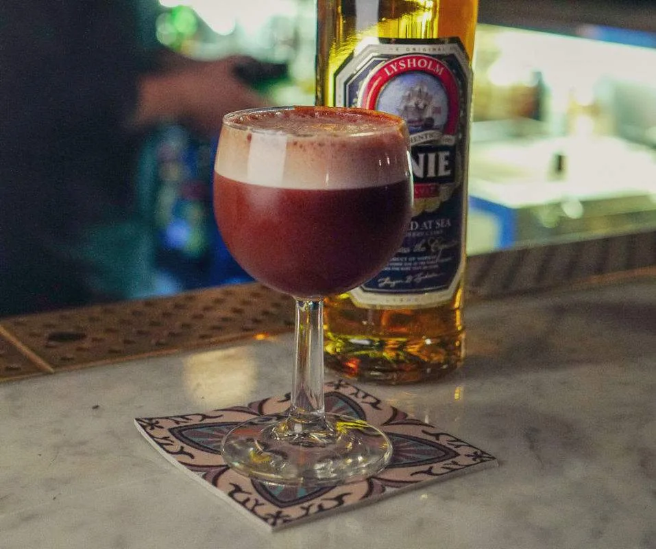 Cocktailen besto av: Linie Double Cask Port som var infusert med timian, cream sherry, English Breakfast tea (med glitter), vaniljesirup og Plum Bitters.