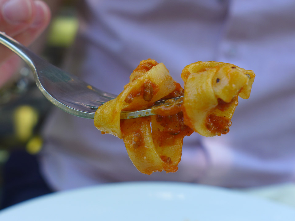 Du må bestille bord her på kveldstid, for det er alltid fullt. De har også noen utebord som er hyggelig å sitte ved. Kastanjetrærne i Bygdøy allé (de få som er igjen) skjermer perfekt for solen og man kan sitte å observere SUV’ene som suser forbi og kundene til Fjelberg (Norges beste fiskebutikk) som handler hummer i dusintall. Jeg har ikke noe imot frognerfolket altså, jeg bor tross alt her selv. Men mange tilhører er en litt annen verden enn den jeg lever i. Det skal sies at klientellet på Enoteca også har et rimelig stort snev av vestkant over seg. Men jeg synes det er supermorsomt å lytte litt på samtaler om leiligheter i Paris og spaferier på Mauritius. Man skal ha sin dose av slike samtaler også for å veie opp i livet, er du ikke enig? Og maten på Enoteca er som sagt helt fantastisk. Store, rause porsjoner med pasta. Sprø pizza mer deilig fyll. Perfekt temperert vin i glassene. Jeg elsker stedet!