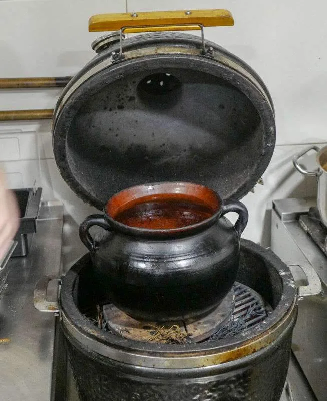 God kjøttkraft av okse, gode tomater i terninger, paprika i terninger, løk i terninger, finhakket hvitløk. Han varmet alle ingrediensene over tid på grillen og han la rosmarinkvister på grillen for å gi god smak til sausen.