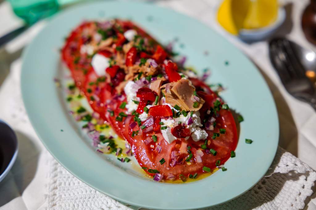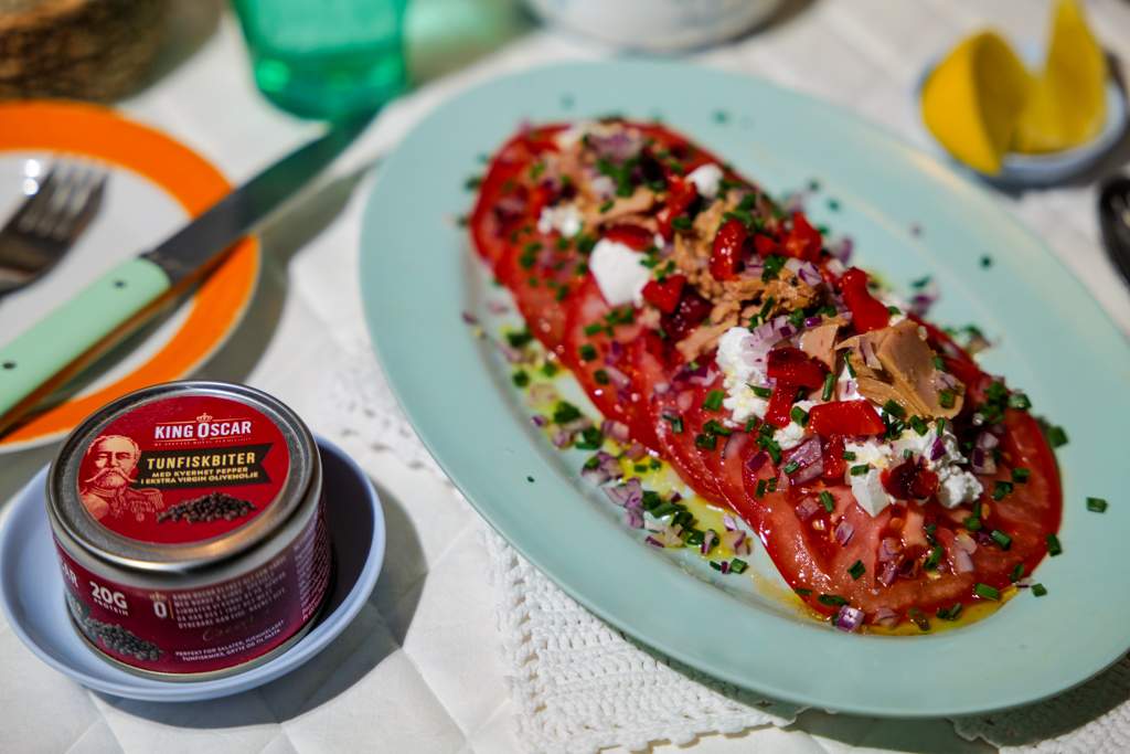 - Skjær tomaten i skiver. Strø litt flaksalt over. Legg lagvis med fetaostbiter, tunfisk, paprika og rødløk. Press noen dråper sitron over. Strø over gressløk og til slutt, rett før servering heller du litt brunet smør over.