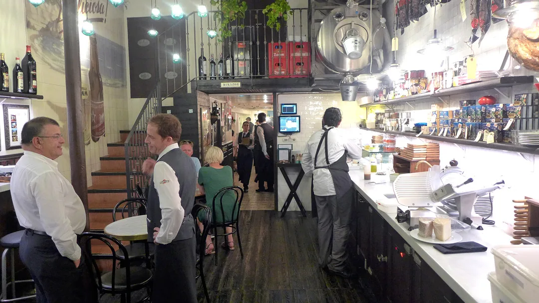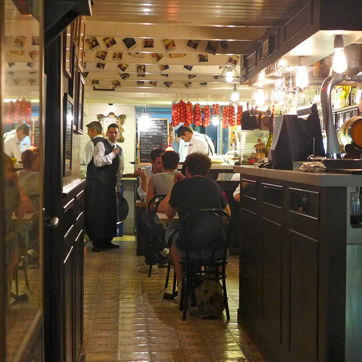 Maten er tapas og det er Tickets-kvalitet på det, selv om det er mye enklere presentert. Kvaliteten er fantastisk og du kan kjøpe med deg mat hjem i bokser, glass fra hyllene eller hengende som spekeskinker og pølser på kroker i lokalet.