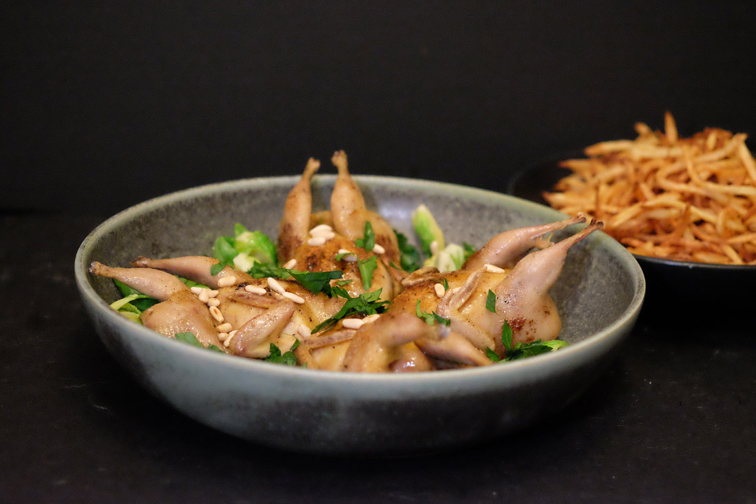 - Legg vaktlene på et pent fat, legg på rosenkål, dryss litt bladpersille over, samt litt av sausen. Server saus ved siden av sammen med taffelpoteter.