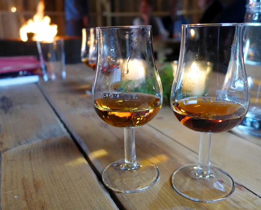Vi nyter den i peisestuen på det flotte senteret før vi går opp i lavvoen for å få en innføring i St Remy og forskjellene mellom brandy og cognac. All cognac fra området Cognac, kan kalle seg Cognac (litt som Champagne kontra cremant, vet du). St Remy er blandinger av flere typer druebrennevin og kommer i utgavene: VSOP, XO og Reserve Privée (kommer på polet i september).