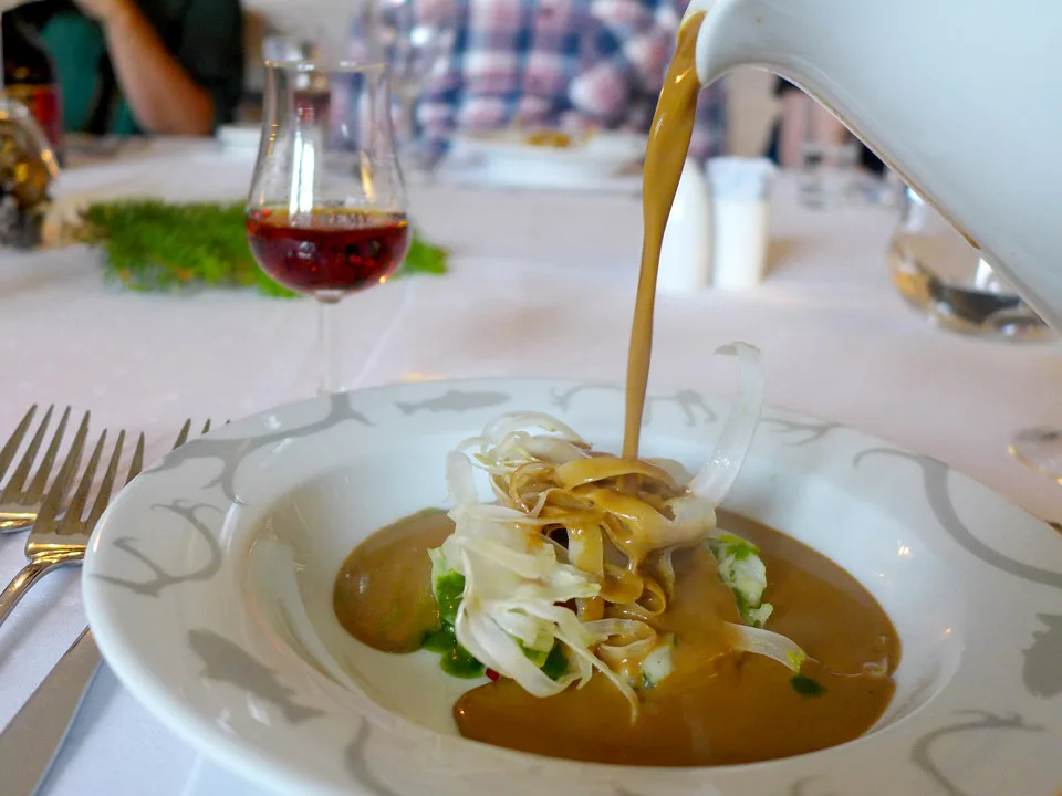 4. rett: Hovedretten og en porsjon som kan ta livet av en voksen kar. Her er det mye mat. Men som sagt, dette er beregnet for jegere som har vært hele dagen ut i skogen og som er sultne som ville dyr. Retten serveres med røvin og er: Elg som har ligget i saltlake, så sousvidet på 56 grader i 6 timer, persillepuré, presillerot, poteter kokt i fett, brunet løk, purre og en bærbasert sky til. Det er høy standard på maten og det smaker nydelig. Retten er også visuelt meget vakker med persillepuréen som forestiller en mosematte der elgen hviler, og purren ligger som en trestamme over kjøttet.