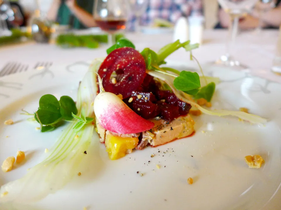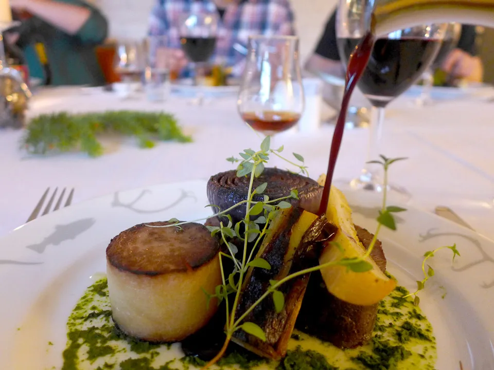2. rett: Foie gras-terrin med gravet rypebryst, bringebær, gauksyre-blader (plukket rett utenfor døra), rå rødbeter, peanøtter og stangselleri i tynne shaves. Gauksyre og rå rødbeter er en fantastisk match! Og den fete terrinen passer perfekt til St Remy XO. Gravet rypebryst var en ny og deilig smaksopplevelse. Jeg må si jeg er veldig positivt overrasket over det høye nivået på maten her, ikke minst på de kreative smakskombinasjonene som fungerer aldeles utmerket.