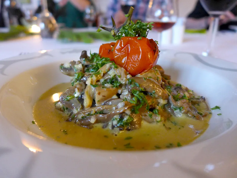 3. rett: Toast med steinsopp, bakte tomater, persille, sjalottløk, egg og fløte. Her får vi servert senteres egen jegervin til , men jeg må smake Xo’n til, og den smaker nesten som en armanac. Faktisk en veldig god match. Retten er så deilig, så deilig. Sopp behandlet med respekt og som en perfekt rett alene også.
