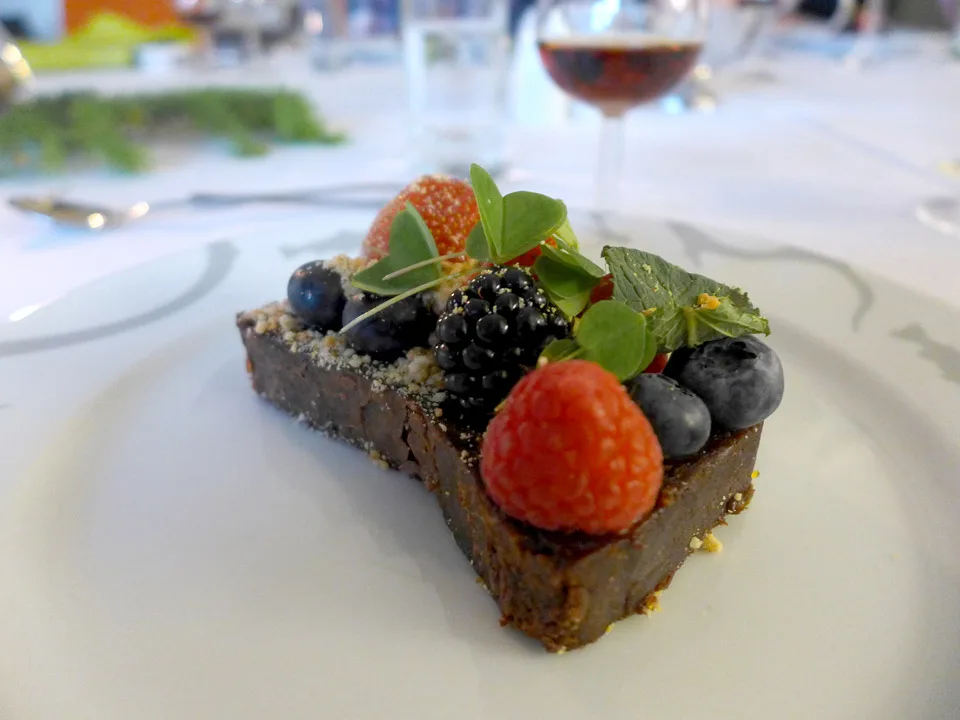 5. rett er en fantastisk sjokoladekreasjon med bær, gauksyre og saltet toffee. Her får vi smake den nye brandyen fra St Remy Reserve Privée som kommer på polet i september.