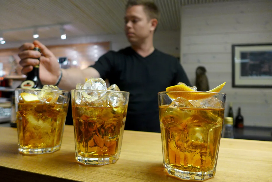 Ha alle ingredienser i et røreglass med is. Hell over i whiskeyglass med isbiter, og ha i appelsin-zest som garnityr.