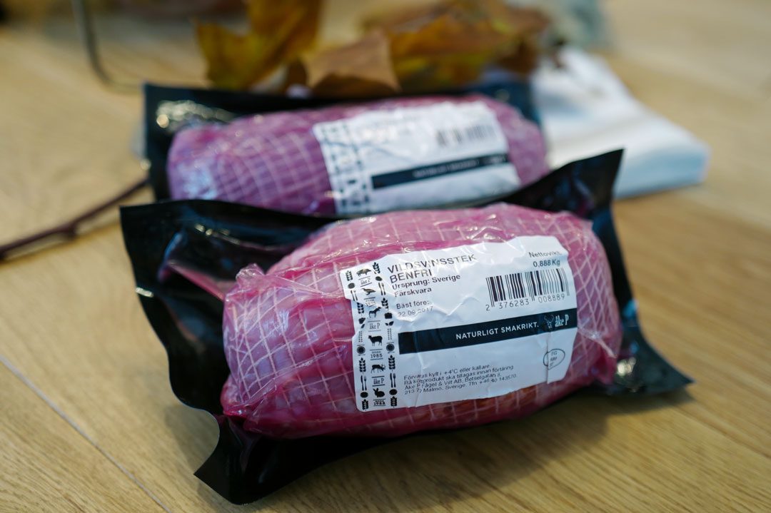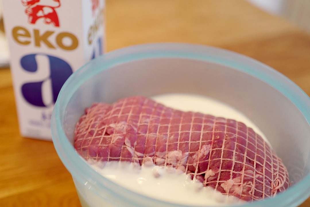 Før man bruker villsvinkjøtt må man legge kjøttet i kulturmelk natten over. Dette er for å fjerne syrligheten i kjøttet. Jeg tok med en kartong A-fil fra Sverige og la stek og melk i en plastpose til dagen etter. Nå er det klart til bruk og du skyller av melken og tørker kjøttet. Villsvinsteken kommer i «strømpe». Denne strømpen laget av elastisk tråd samler steken så den holder formen under steking. Strømpen klippes opp og fjernes før servering.