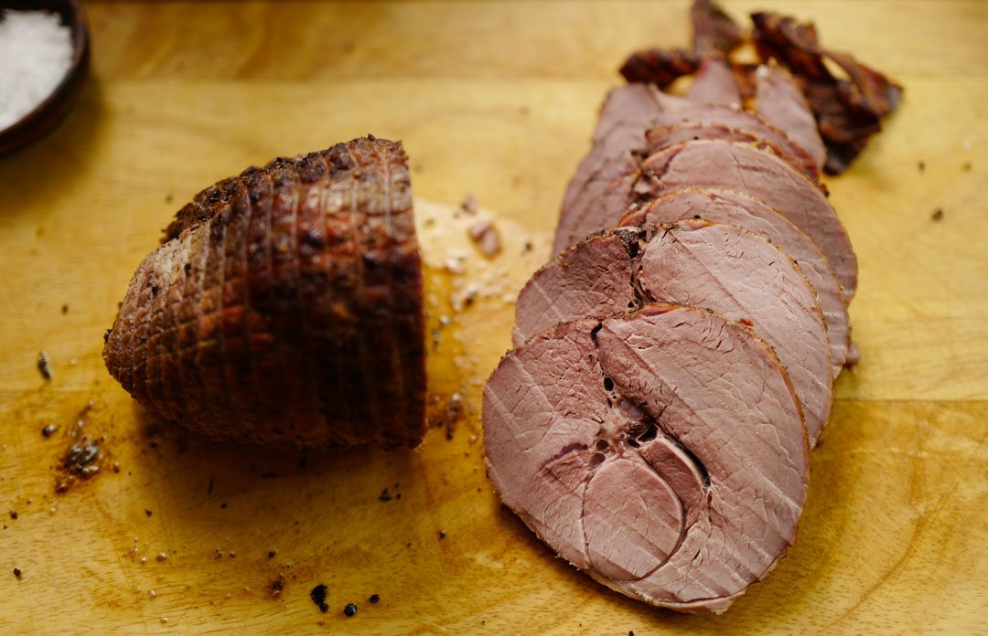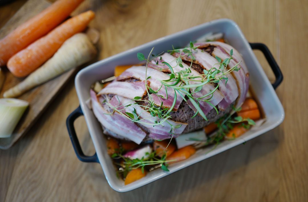 La steken hvile i 15 minutter før du skjærer av «strømpen» og skjærer steken i skiver. Legg baconskivene ved steken.