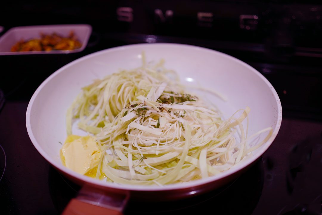 Skjær så mye du trenger i strimler. Ha dem over i en panne med en god klatt smør og 1/2 vann. La kålen dampe i smørvannet. Tilsett salt, pepper og urter som timian og rosmarin. Etter et par minutter tilsetter du en god klunk med grädfil.