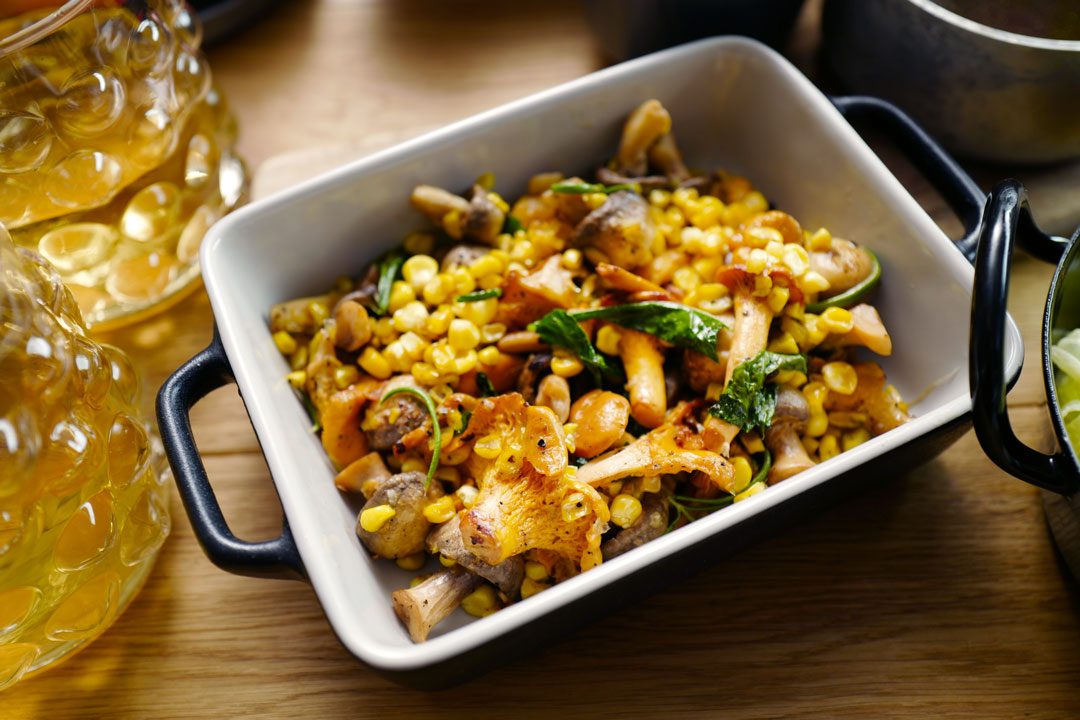 Stek sopp, mais, hvitløk og urter i smør og olje. Tilsett olje og svartkålblader etter noen minutter. Rør inn noen skjeer grädfil. Krydre med salt og pepper.
