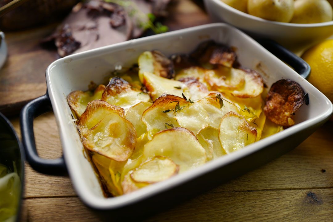 En god potetform blir enda bedre med tynne skiver gulbeter. Trust me! Skjær defor tynne skiver av både ferskpotet og gulbeter og legg dem lagvis i en ildfast form. Dryss lagvis med flaksalt, hakket hvitløk og hakket timian.